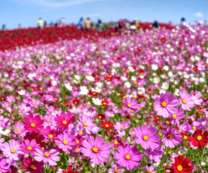 Сначала полюбуйтесь великолепными холмами Национального приморского парка Хитачи. Известный своими сезонными превращениями, этот парк — рай для фотографов. В зависимости от времени года вы можете прогуляться по полям нежно-голубой немофилы (весна), ярких подсолнухов (лето) или сюрреалистическим красным кустам кохии и розовой космеи (осень). Это одно из самых фотогеничных мест Японии, предлагающее захватывающий вид на цветы, сливающиеся с небом и океаном.